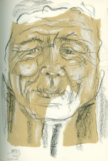 I am carrying on with the 10 minute sketches of heads of older women, this is the seventh and I’m relaxing into it. I’ve chosen to focus on women of advanced age because it’s a group of people that doesn’t seem to appear much in visual cultural references. Of course, there are iconic older women, like the actress Helen Mirren and the late Mother Theresa but in the general imagery around us, advertising, magazine covers, television and films, older women don’t feature much. Even when they do, they’re often Photoshopped to look much younger. It’s no wonder that so many women feel the pressure to have facelifts and botox in order to remain visible. So in my own small way I’m saying, “Hey, look here. Here are some older women. And they’re fab.”
