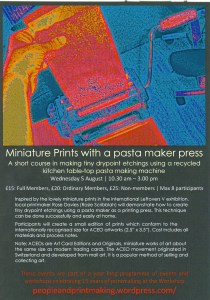 The exhibition runs at Swansea Print Workshop, 19a Clarence Street, Swansea for the week, 10.30 – 4.00 daily and on Wednesday the 5th August there is a training day about making miniature drypoint prints with a domestic pasta press. Pre-booking is essential on 01792 464418.