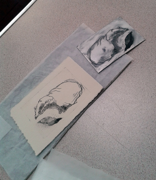 I ran a short course in using a pasta maker as a printing press at Swansea Print Workshop today. We used paper drypoint plates to make miniature prints. I very quickly re-sketched a drawing of a badger from my sketchbook and cut it into the plate with a drypoint tool. The nose is a bit too long, it’s almost an anteater – a badge-eater! πŸ˜€