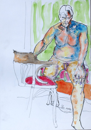 Here is another of the series of ink and watercolour nudes I did a while ago. This is an older male model I’ve worked with for years, he’s a stalwart of the life drawing group at Swansea Print Workshop. I did the line drawing with Faber Castell Pitt drawing pens. They’re my favourites and I’ve been using them for about a decade now. They’re waterproof, permanent and lightfast and they are very smooth to draw with. The watercolours are Winsor & Newton artist quality half pans and I have used a Cotman watercolour sketchbook, size A3.