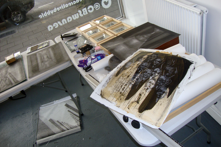 I’m working at the Creative Bubble Artspace for a few days, with the other members of the 15 Hundred Lives art collective. It’s really useful to have the space to spread out and work together, discussing the mix of our work and how we’re going to frame and hang it.