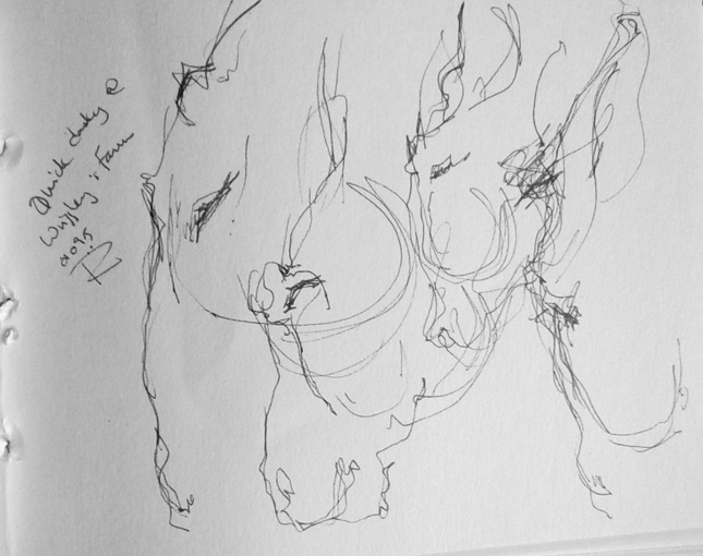 It’s been a very busy few weeks, personally and professionally and I haven’t been keeping up with my sketchbook drawings. I should be doing a scribble each day but I’ve lapsed. So today I went back to basics. Husb and I went to a family birthday, our little great-niece is three and we celebrated at Wriggley’s Fun farm, a lovely little petting farm a few miles from Swansea. Out came the sketchbook, my leather steampunk one, with my Faber Castell Pitt drawing pen and scribbling ensued. A lovely, elderly donkey obligingly munched away and a curious sheep stood still with knock knees and watched closely to see if I had any treats for her. I did.