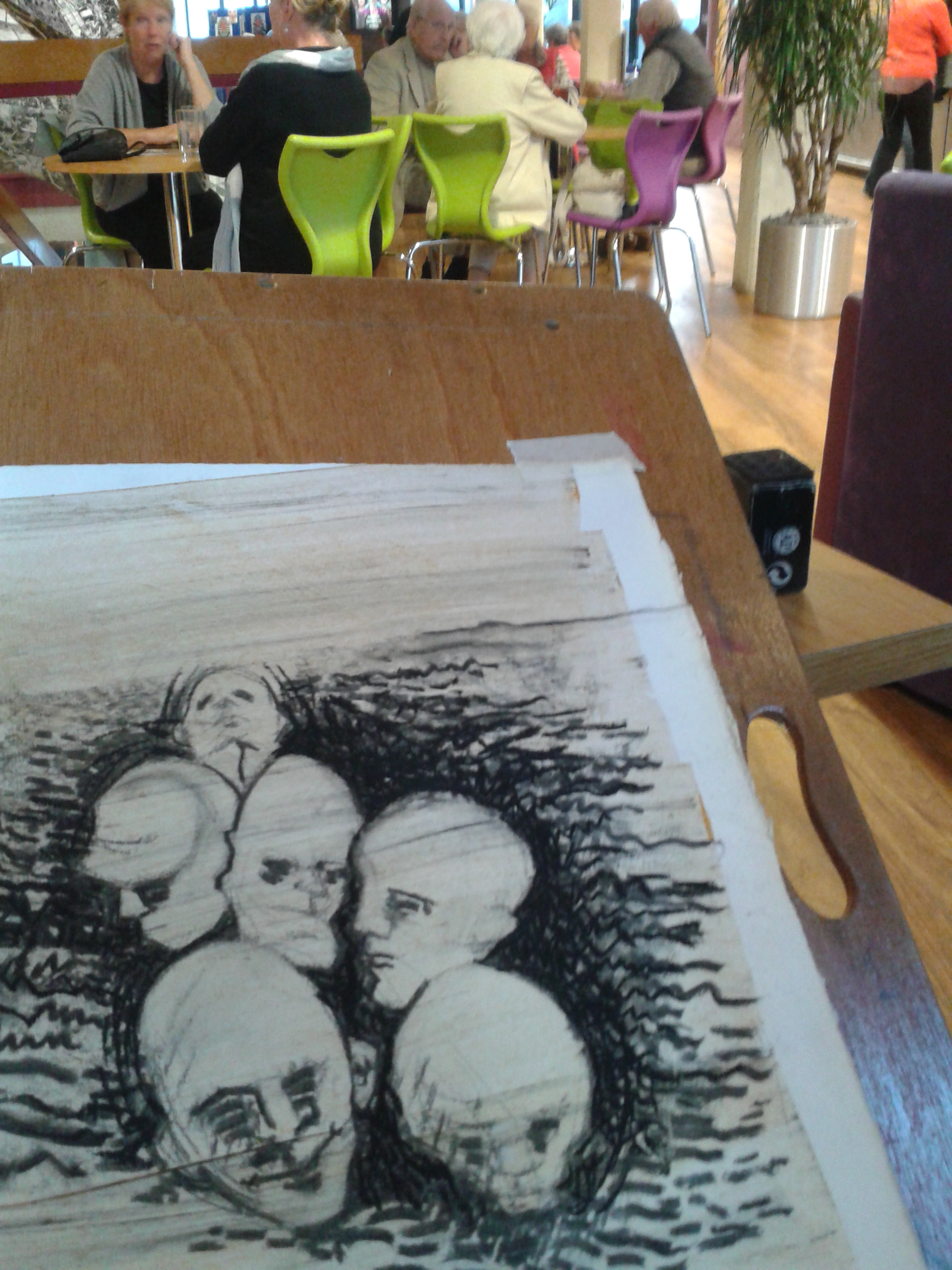 I sat and worked on a piece of vintage paper that I’d prepared with a layer of gold translucent silk screen ink, applied with a squeegee (but no screen). Continuing with the theme of the work in the exhibition, I did some intuitive drawings of heads using willow and compressed charcoal and carbon. It’s nearly finished, maybe another hour or so. It was great drawing in public. The first couple of hours was quiet but 4 people came in to sit down and talk to me. I like having conversations about art. The last hour was much busier as the cinema-goers arrived for a pre-film drink. Not so many conversations but lots of people hovering and looking at what I was doing.