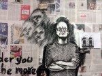 I’m working in an old shop in the centre of Swansea; it’s on loan until it gets demolished and I’m there with some other artists; we’re using as a pop-up artist’s studio. I papered the wall with newspaper and blocked some basic figures in white emulsion. I like working onto newspaper, I can incorporate images and headings into the work. I also like the texture of the charcoal on top of the brushstrokes and the wrinkles in the newspaper. I’ll be carrying on for a couple of weeks and when the demolition crew moves in, it’ll all be knocked down to make way for urban regeneration.