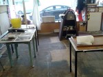 I have been doing some printmaking at The Bagpuss Window, the temporary artspace in Swansea’s High Street, making a little edition of miniature drypoints (similar to etchings). I set up a printing area around the little etching press, with an inking table, a blotting table and a drying table. I measured and ripped 8 pieces of Bockingford 250gsm paper and put them into a bucket of water to soak. I like to leave them for at least an hour.