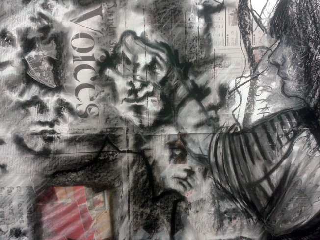 Rain is forecast for the next couple of days so I can stay in and take stock of everything that happened at The Bagpuss Window. I took loads of photos and did a lot of filming so I need to start collating all the images and then decide what I’m going to do with them. So much happened and it would be a shame not to document and publish it. Here’s a detail of the large wall drawing I did. Most of it was spontaneous and done under the influence of gong music. More of that to come…..