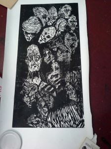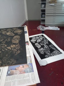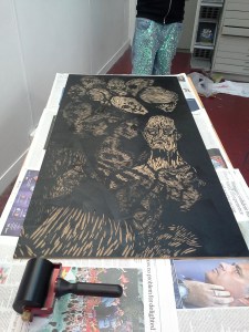 Today was day 2 of a Masterclass with woodcut artist John Abell at Swansea Print Workshop and I carried on cutting the humongous piece of MDF I started yesterday. I used compressed charcoal to darken the surface while I cut with my Flexcut tools. Finally, I reached the point where I wanted to get an idea of what it would look like printed up – you can always cut more away but you can never replace it once it’s gone. So I printed a proof print. This is a first pull, to see what you’ve done and decide whether it’s just right or needs more work.