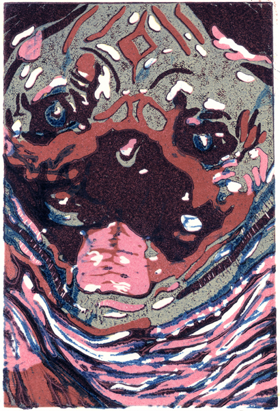 This work is done using the suicide method of block printing. For this you produce a multi-coloured print using the same block, by progressively cutting away each colour. You end up totally destroying the block, so there’s little room for error and there’s no chance of ever doing a reprinted edition.