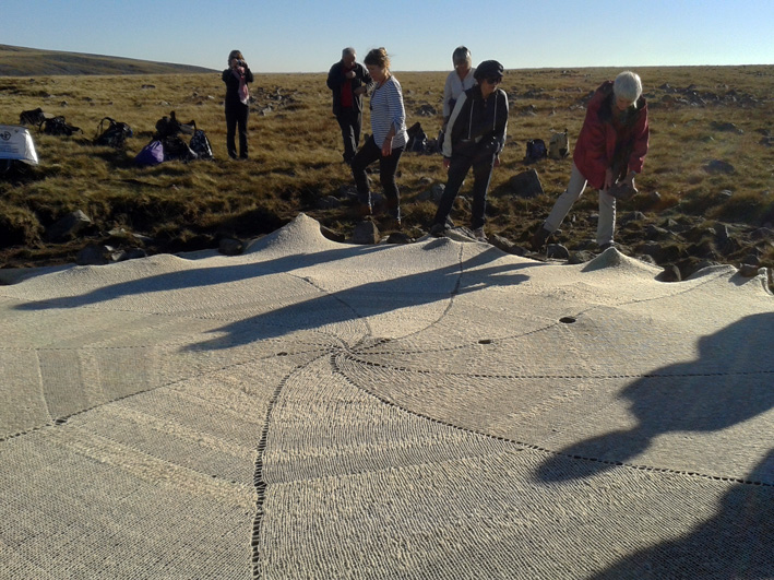 Another unseasonable warm and bright day, but glorious weather to say goodbye to artist Ann Jordan’s ‘Cwtch’, a giant woollen blanket and environmental installation. You can read more about this extraordinary piece here. It is in it’s final resting place, a circle of eroded peat bog up on the Black Mountain in the Brecon Beacons National Park in South Wales. A multi-generation group went up the mountain with Ann and some rangers from the national park and helped to stretch and lay it in place and then, after weighting the edge with local stones, we scattered a sackful of local heather seed over it. The blanket should provide a good environment for the seed to germinate and grow and stop the patch from further erosion.