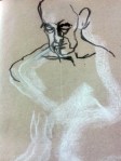 I drew into an A2 sketchbook made up of brown paper and used white chalk and Winsor & Newton willow charcoal. The brown paper provides a handy mid-tone. Our model is an older man, so interesting to draw.