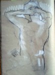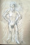 At the start of our life drawing sessions at Swansea Print Workshop we have a few quick warm-up poses, typically no longer than 5 minutes each. They’re useful, especially if I’ve had a break and I’m a bit rusty. The first one is often awful; this one looks like Mr. Blobby, awkward, ugly and completely out of proportion. The second is much better, but still a bit out of proportion. The third pose is where I’m getting into my stride though, comfortable with the materials – chalk and willow charcoal into an A2 brown paper sketchbook – and comfortable with the model’s proportions.