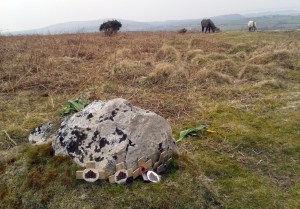 The monument is a Neolithic burial chamber, one of the first sites to be protected under the Ancient Monuments Act (1882) and it’s long association with the dead is reflected in the offerings that are often placed on it or nearby. This week I found a memorial around a small stone on the periphery of the site, simple wooden crosses with regimental badges and some flowers. We found another offering, or maybe a shrine, up at Llyn Fawr in the Cynon Valley a couple of weeks ago. A hoard of ancient votive offerings, including bronze cauldrons and arrow heads, have been found in the lake and it’s a popular place for anglers. Somebody had carefully set up this little chap nearby, perhaps to encourage the local water spirits to look favourably on their fishing. The tradition of acknowledging the importance of these places continues through the millenia ……