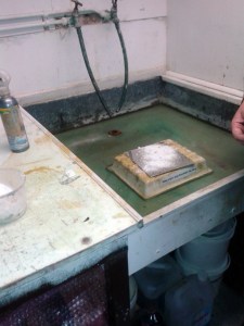 I spent a happy but exhausting weekend at Swansea Print Workshop on a specialist course in the ‘BIG’ non-toxic etching technique, pioneered and taught by Andrew Baldwin of Trefeglwys Print Studio. Andrew has invented a new etching ‘ground’ and has also experimented with a range of household materials to take the place of some of the toxic chemicals used in traditional etching. We started by degreasing some plates with whiting powder (powdered chalk) and soy sauce. It makes a terrific degreaser and is far safer than the ammonia I remember using in art college, back at the end of the 1970s. Once the grease had been cleaned off, we rolled the red ‘BIG’ ground onto the copper plate, keeping the aluminium plate for a coffee lift and spit bite. More about that tomorrow…….