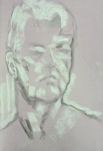Just back from life drawing at Swansea Print Workshop, working with an older woman model who is one of my favourites. She is a strong woman with strong features and a strong body, inspiring to draw. I did one portrait study, working with charcoal and chalk into my A2 brown paper sketchbook. I used my fingers to draw as well, smudging the charcoal to make the lines bolder.