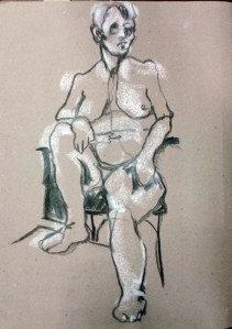 Here’s the last of the 3 drawings I did during the life drawing session at Swansea Print Workshop this week. I blocked in some rough highlights in chalk and then did a continuous line drawing with a stick of carbon into my A2 size brown paper sketchbook. It’s a technique I really like, it’s good practice and I like the effect, it’s dynamic.