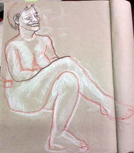 As I developed this drawing, from an initial mass of white scribbles, the style that emerged was distinctly comic-book-like. Which is OK with me. I wasn’t afraid to distort the body slightly to fit the space – if it’s good enough for Egon Schiele, it’s good enough for me. I used white, sanguine and black conté crayons into my large, A2, brown paper sketchbook.