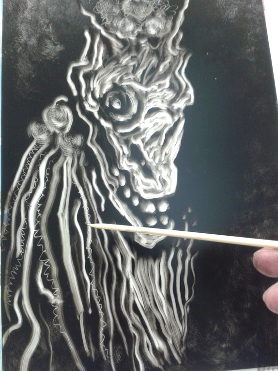 Previous Image Next Image mono-2 Using various things for drawing – wooden skewers, cotton buds, scrim, rags……