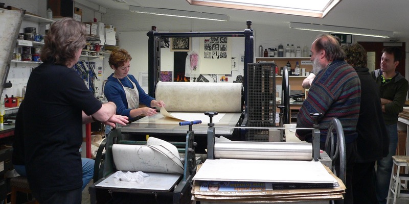 Demonstrations of techniques 11.00 | Monotype printing | Rose Davies |11.30 | Screenprinting | Sarah Hopkins | 2.00 | Watercolour Woodblock | Judith Stroud |2.30 | Inking up and printing an etching plate |Ian Fisher |