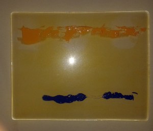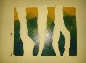 The results are okay for a first session. I’m used to doing monotypes onto a hard perspex (plexiglass) surface and I’m not sure whether I would use this technique for my own printmaking, but I need to do more experiments. I can see me using this technique to produce collage papers though. Next time, I think I’ll try with my Caligo Easywash inks and Liquitex Heavy Body acrylic. I’ll let you know …..