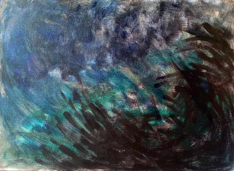 I was doing some teaching today and there was some acrylic paint leftover, good stuff, Liquitex. Waste not, want not, I thought and used it up on a canvas board. I rubbed a layer of black on first, in a rotating motion with a large stippling brush and when that was dry, a layer of diluted green/blue and finally, working from the bottom right with a blunt hoghair brush and some maroon. It’s completely random but I need to loosen up my techniques and work more intuitively. It’s also good for my students to get into the habit of using up all their materials and trying out different things.