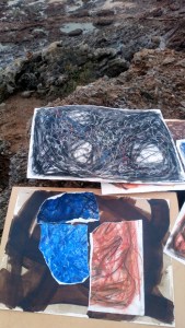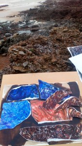 We clambered down a steep, rough path and settled about 30 feet above sea level, on a flat area that is the remains of a rare Ipswichian raised beach, which was the sea level sometime in the past, probably before the last Ice Age. It was a good place to work, I laid out my board and ripped the different collage papers, laying them down on the watercolour paper and rearranging them, taking photos as I worked, inspired by, rather than slavishly copying, the environment around me. It’s an interesting way to work outside; the work of art is ephemeral, it exists in the camera. When I finished I smooshed the paper back into my folder to use another day.
