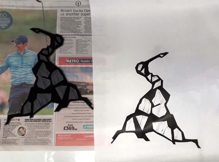 A few weeks ago I went on a field trip up into the Brecon Beacons with colleagues from Swansea University’s FIRE Lab and while they studied the environment in culverts, I sketched. I really liked the abstraction of this drawing of a stream bed so I cut it into a block of vinyl and today finally started doing some proof prints down at Swansea Print Workshop.