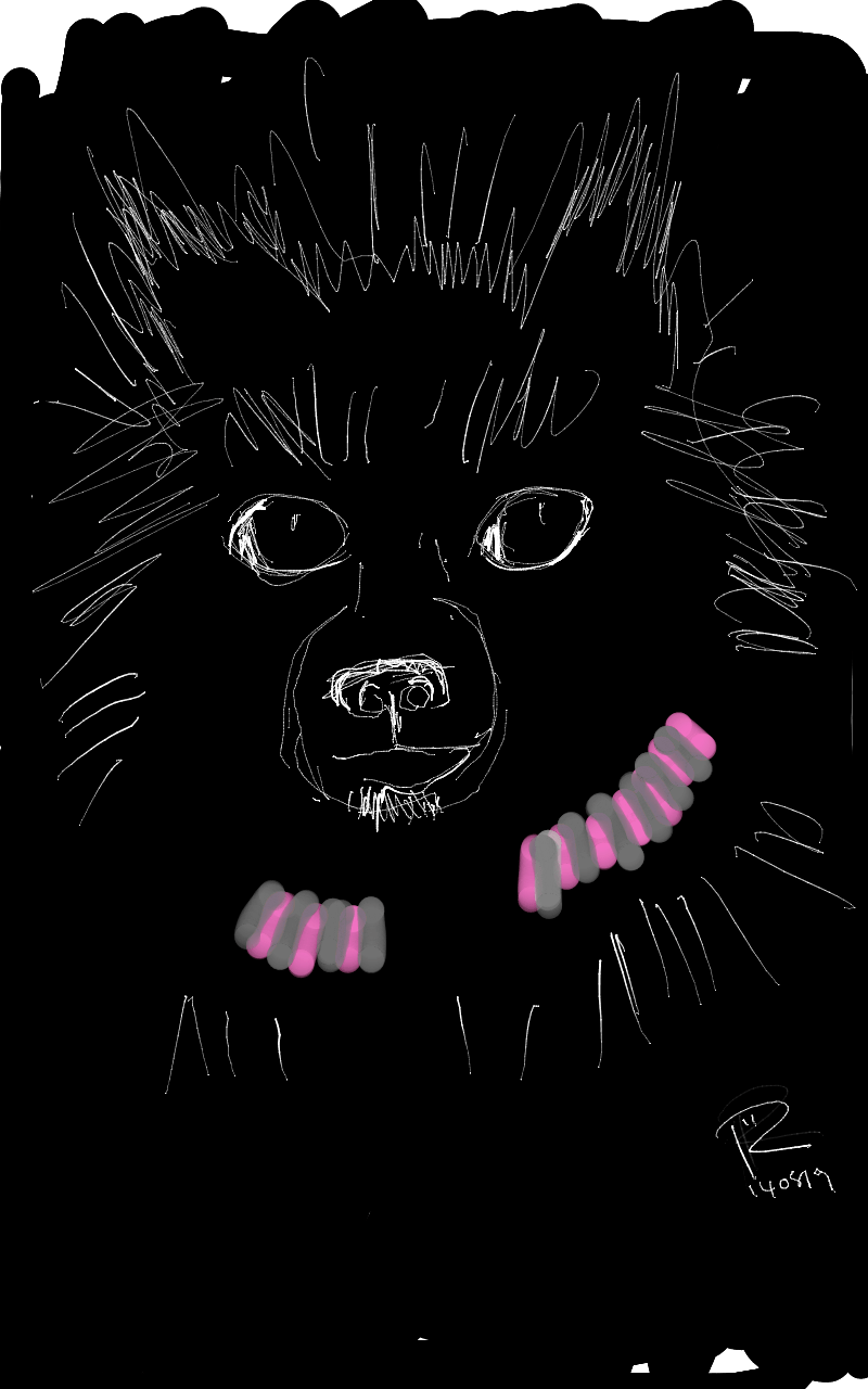 The dog had a bath and now she’s running around like a maniac! Husb and I are dog-sitting while her people are on holiday. She’s a Pomerpoo – a Pomeranian / Toy Poodle cross – very small with lots of black fluffy fur. When we bathed her it stuck up all over the place. She’s not too pleased about it. Sparta Puss thinks it’s quite funny though.