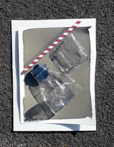 Here are a couple of the ones I developed today alongside photos of them being done en plein air. The first is a Teasel, an ancient plant that used to be used in woollen textile manufacture and their seeds are a favourite food of the European Goldfinch. The second is some rubbish we picked up on our walk.