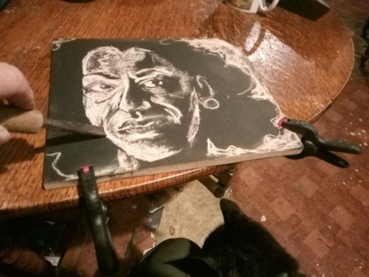 One of the ‘bloody women’ I’m paying tribute to in the upcoming exhibition at Cinema & Co Swansea is Andrea Levy. I was impressed and depressed by her novel ‘Small Island’ (about the unbelievable levels of discrimination meted out to the Windrush despite them being invited to live in the UK after WW2) when I read it 10 years ago. She admitted to developing a flinty bloody- mindedness in order to get published in her final interview -released on R4 recently & really worth a listen. Here is the woodcut of her beautiful face in progress but you’ll have to pop into the toilet in C&Co to see the finished print….