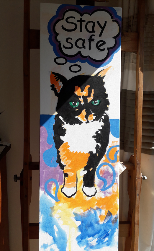 Finished the cat picture. It’s gone into my window. I live in a very diverse area and one of my neighbouring houses is a care in the community home for adults with mental health issues. We stop and chat often and they have been really chuffed with the art that Husb and I have been putting into the window, mostly temporarily, so we decided to do some permanent pieces, related in some way to The Pandemic. Husb is still working on his. These long thin Winsor & Newton canvas panels are a good fit for our front windows and they can be seen from the street.