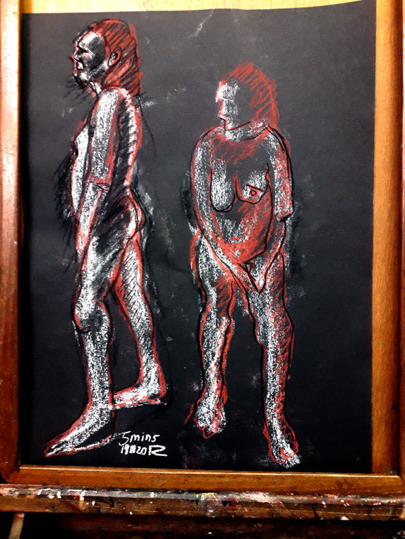 Just back from life drawing at Swansea Print Worksop and I’m shattered. So I’m off to bed. I used black, white and sanguine conté crayons onto black paper.