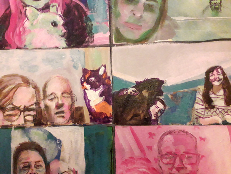 I’m really cracking on with this big painting now. I hope that a couple more good spurts of activity should get it finished. I concentrated on getting some of the finer features in their place and doing a bit of work on the three animals. The cat looks bonkers. Nothing new there.