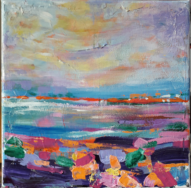 Back to Friday lunchtime Cheese and Wine Paint Club with Ed Sumner on Facebook today. An abstract landscape this week, not my type of thing if I’m honest but I learnt a lot about applying and layering paint. I used Liquitex Heavy Body acrylic onto a small stretched canvas, using brushes, palette knife and fingers.
