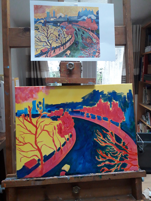 It’s Faking Friday again with Ed Sumner’s Cheese and Wine Painting Club on Facebook. This week we copied “Charing Cross Bridge” by the early 20th century Fauvist artist Andre Derain. I’ve always loved the work of the Fauvists, the word is derived from the French Fauves – wild beasts. Matisse is probably the most famous of the group. I’ve almost finished – maybe another hour over the weekend should do it.