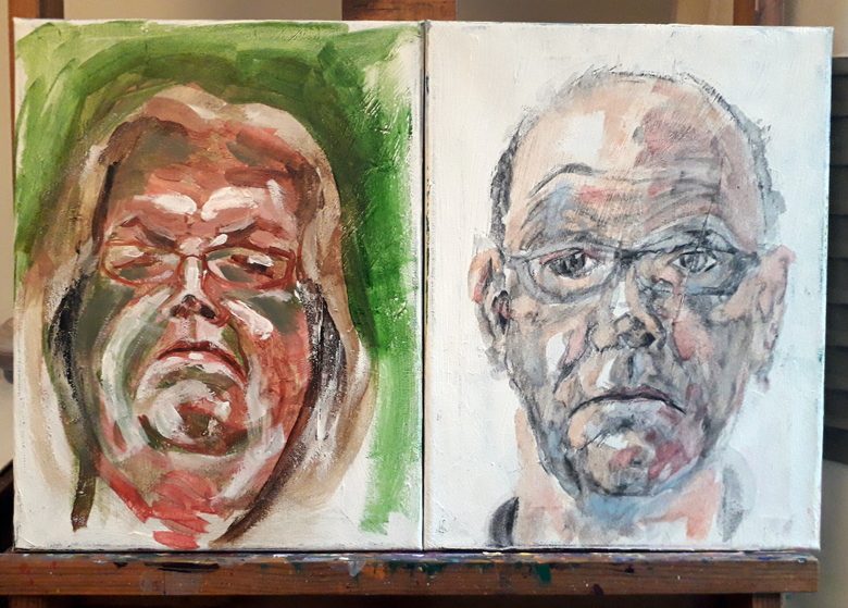 Husb and I participated in a self-portrait painting workshop today, led by the fabulous Welsh artist Tomos Sparnon and hosted by the most excellent GS Artists in Swansea. Of course, it was on Zoom as we’re still in lockdown but I’m enjoying online learning, both delivering and receiving. Today we worked in acrylics on canvas, pretty quickly. These are a long way from being finished – quite a bit of work left to do. Lots of people think that artists just go Bish Bash Bosh and a work of art appears, but that’s not so. It’s hours and hours and layers and layers and loads of mistakes, corrections and frustration that goes into making an artwork. I’m not sure self-portrait is the right description for these two at the moment – mugshots more like. Never mind, I’m sure they’ll improve 😀