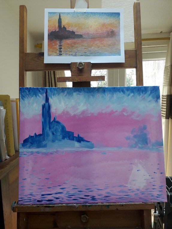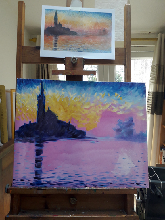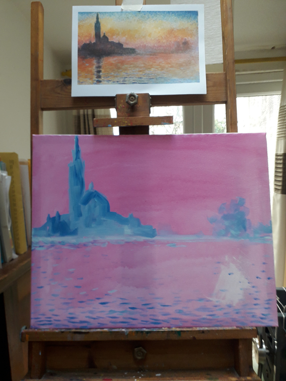I finished Friday’s fake with minimum faffing this week. I paint along with Ed Sumner’s Cheese and Wine Painting Club each week and I usually spend a few hours over the weekend finishing the paintings. But this week I only did about half an hour extra. This composition, Monet’s “San Giorgio Maggiore at Dusk”, is quite a simple composition so there was plenty of time to concentrate on applying the paint. Monet used many layers of colours, overlaid in dashes, but I find that once I get stuck in, the paint goes on fairly quickly. Here are the stages of the painting.