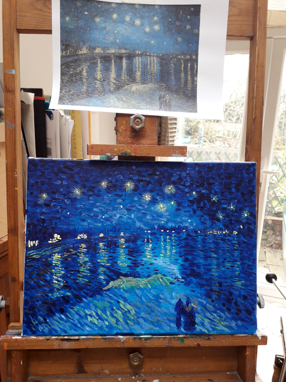 It’s Faking Friday again with Ed Sumner’s Cheese and Wine Painting Club over on Facebook. This week’s masterpiece is Starry Night Over The Rhone by Vincent van Gogh. I’ve done most of it, but still a bit more over the weekend, layering up the colours in small textured dots. I’ve been doing these weekly for almost a year now, since the first lockdown, nearly 40 paintings. The practice has been good for me.