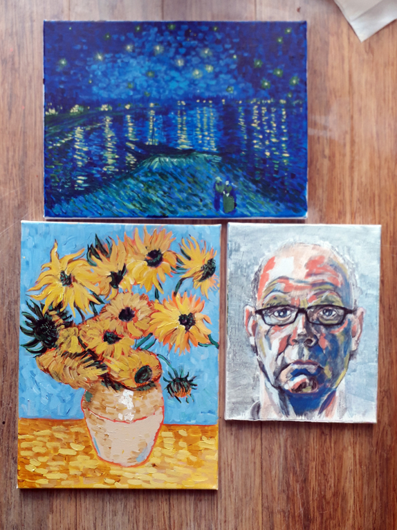 Husb and I had an arty morning today. I carried on working on two of the paintings I’m copying at the moment and Husb did some more on his self-portrait. I’ve been doing copies every week with Ed Sumner’s Cheese and Wine Painting Club on Facebook for almost a year now and Husb began his selfie a couple of weekends ago in a Zoom tutorial with the 9to90 Creative Community at GS Artists in Swansea.