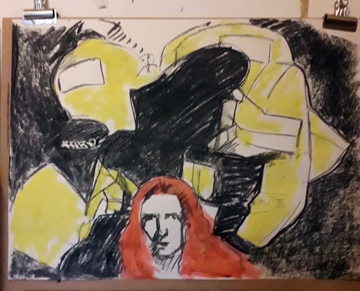 Sometimes you see an image that jumps out at you – one that might well become iconic. This is one of those images, from a photo of the arrest of Patsy Stevenson by Hannah McKay: Credit Reuters, taken at yesterdays vigil for the murdered Sarah Everard in Clapham Common, London. Willow charcoal, gouache and watercolour on paper.