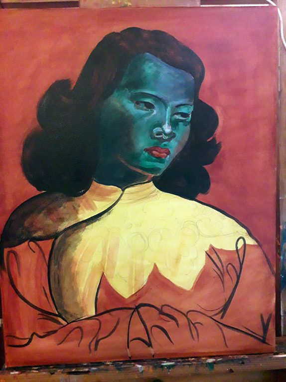 She’s green and this is possibly one of the cheesiest paintings of the 20th century (1952). She’s The Green Lady (also Chinese Girl) by the Russian painter Vladimir Tretchikoff. I did a Zoom tutorial this evening with Ed Sumner, who runs the Cheese and Wine Painting Club on Facebook on Fridays. It’s a late one and I’ve just finished – shattered now and need my bed. A little bit more to do on this – softening the tones on the face, adding some highlights and putting in the detail on the yoke of her dress.