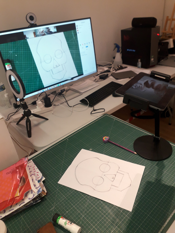 I’m an educator as well as an artist and I’ve spent many years working in adult learning with people who have, for various reasons, been excluded from education to some degree. I work a couple of days a week for a national charity for people who are homeless or vulnerably housed. Covid19 lockdown has been such a challenge. We can’t bring people inside, meet in groups or even work one to one, except in an emergency. Educators all over the world have had to adapt and develop new ways of working. One of these is delivering learning online through things like Zoom. I did one of these sessions today, teaching people how to draw a skull from scratch, with just a pencil and a sheet of A4 paper and then looking at options for decorating them. I used collage on mine, it’s a good technique because it costs next to nothing. We give people gluesticks and the collage can be done with recycled junk mail and old magazines.