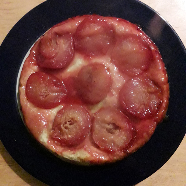 I’ve nearly finished the copy of Vladimir Tretchikoff’s “Green Lady” that I started a couple of weeks ago. I think her head is just about done now, so today I did a lot of work on the yoke of her dress. It’s an elaborate embroidered silky fabric and I’ve never painted anything like this before. I think I’m getting there, just a bit more work on the finer details and I’m done. I started this in a Zoom tutorial with Ed Sumner who runs the Cheese and Wine Painting Club on Facebook. And after wards, I made a plum tarte tatin for teatime 😀