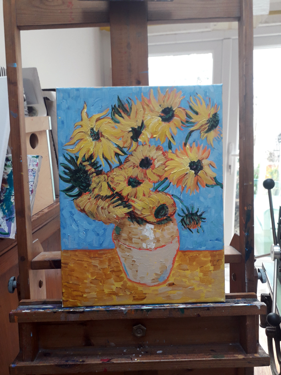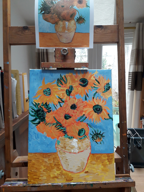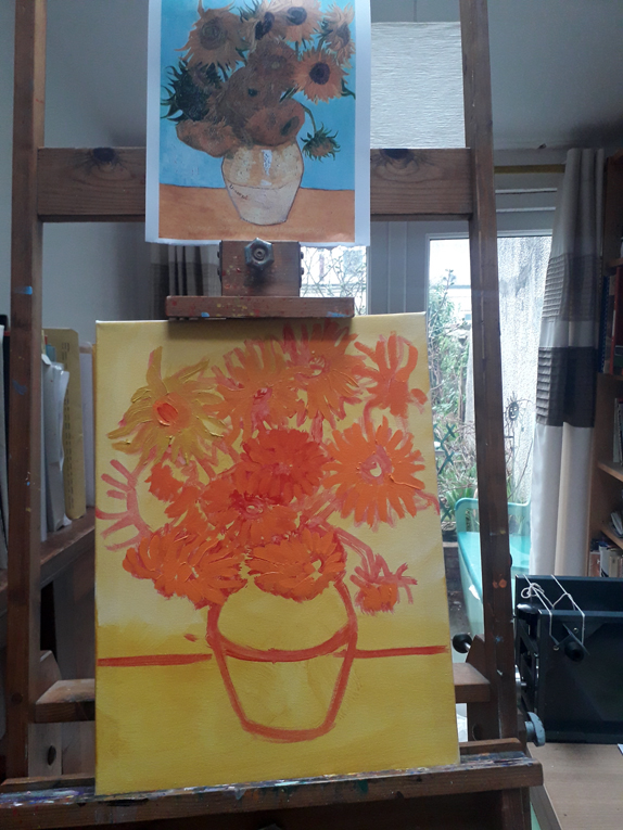 I finally finished faking van Gogh’s sunflowers. I’ve been faffing around with it off and on for a few weeks now. The strange sunflowers at the bottom of the vase took a lot of work and I was stumped about how to do them at first, but then I worked out how to dapple paint on with a palette knife and it started coming together. Here are the stages I went through. Tomorrow – the timelapse video π I did this from one of Ed Sumner’s Cheese and Wine Painting Club videos. He runs a painting session every Friday lunchtime on Facebook.