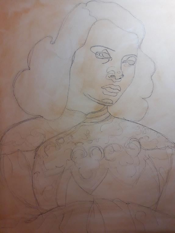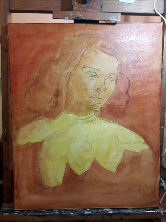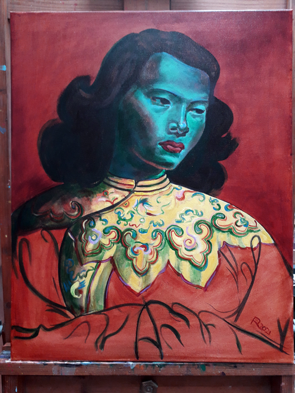 Here she is at last, portrait of Monica Pon-su-san, aka The Green Lady by Russian artist Vladimir Tretchikoff. I started this in a Zoom tutorial with Ed Sumner who runs the Cheese and Wine Painting Club on Facebook a couple of weeks ago. I really liked doing the details on the dress, it’s not something I would normally do. I remember the painting from my childhood, it was one of those that almost everyone seemed to have a copy of. It was immensely popular. I always thought it was the ultimate in kitsch and I still think it’s kitsch, but it’s good, well crafted kitsch and reflects the time it was made – mid 20th century. Here are some of the stages I went through with the painting.