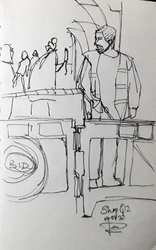Here’s another quick little scribble I did in my sketchbook while I was wandering around the city centre the other day. There were orderly queues everywhere, luckily it was warm and sunny, and there was this council employee power washing chewing gum off the pavement, making it spic and span for the returning shoppers.