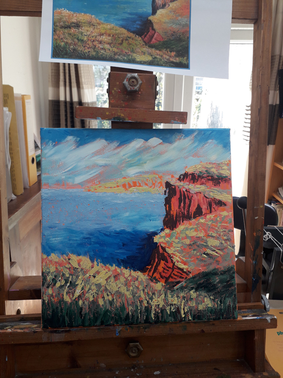I’m carrying on faking this Monet, “Cliffs At Grainval”, but it still needs more work. Not a lot, just a bit more faffing should do it. I started it on Friday with Ed Sumner’s Cheese and Wine Painting Club on Facebook. He’s been running it weekly since lockdown began over a year ago and it’s grown so much with hundreds of people joining in every week to copy a painting by a famous artist. I recently read an article in Artsy about how copying art actually increases creativity, which is good news. Here’s a link if you want to read it.