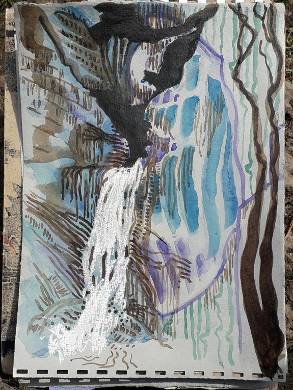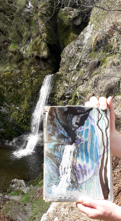 On our last day in North Wales, earlier in the week, Husb and I visited Pistyll Rheadr, a magnificent waterfall near Llanrheadr ym Mochnant in Powys. On the edge of the Berwyn Mountains, it’s the longest single drop waterfall in the UK and is also reputed to be one of the six portals to Annwn, the Otherworld of Welsh legend, that coexists with our own, a bit like a parallel universe. It’s beautiful and neither the photograph nor the drawing do it justice. Both only show the lower drop, the whole waterfall is much higher and spectacular. I used watercolours, my home made walnut ink and white conte crayon onto a rough handmade vintage blue-grey paper.
