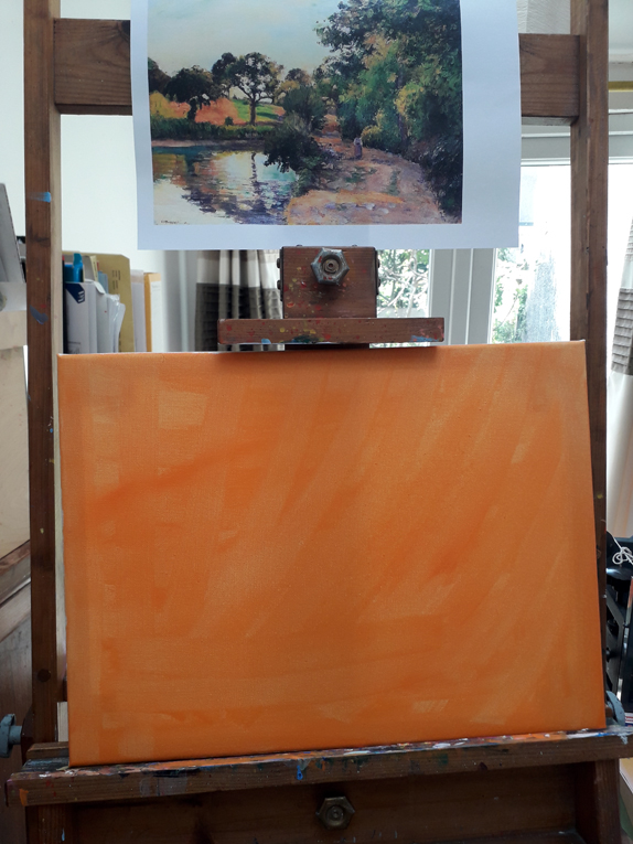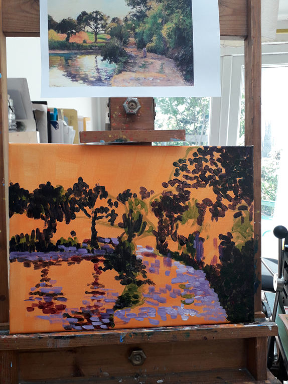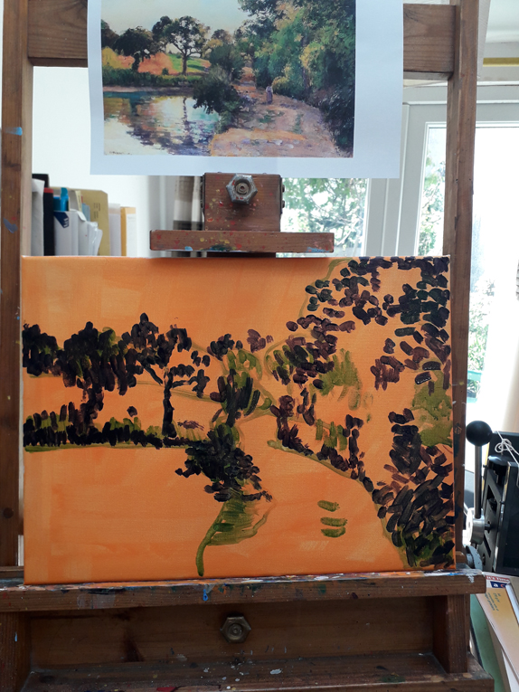 I finished faffing with the fake from Fridays Cheese and Wine Painting Club on Facebook. This is by the French Pointillist artist Camille Pissarro, “Bridge at Montefoucaute”. I didn’t like it when I started, but it grew on me. It involved a lot of daubing which I found very relaxing. Here are the stages I went through.