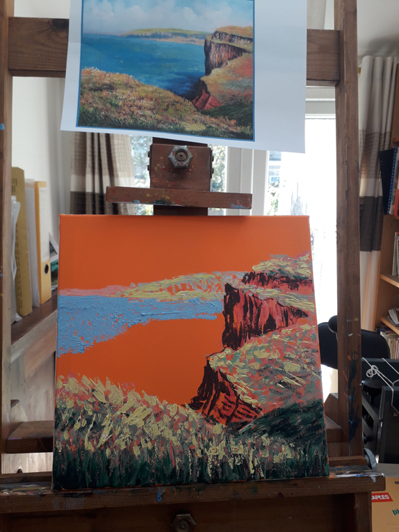 Another fake finished …. I’m on a roll here. This is a copy of Claude Monet’s “Cliff at Grainval” that I started with Ed Sumner’s Cheese and Wine Painting Club on Facebook about a week and a half ago. I didn’t much like it, there are plenty of other works by Monet that I prefer but I’m doing these weekly painting to learn new skills and I think it’s good discipline to push through the dislike and get it finished. Here are some of the stages I went through, using Liquitex acrylic paint onto canvas. Ed has been running the paint club for over a year now, since the start of the first pandemic lockdown and I’ve done about 50 fakes so far.