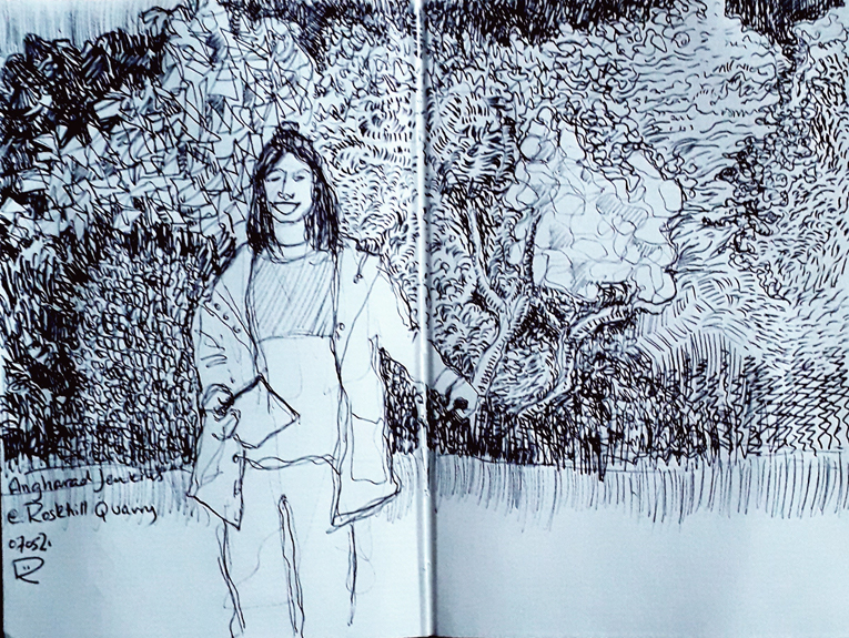 Lockdown is easing and things are starting to happen. Husb and I went to Rosehill Quarry at tea time to listen to Swansea folk musician, Angharad Jenkins, perform her recent song about the Quarry. It was a lovely sunny and warm Spring afternoon and Angharad sang to a group of local people of all ages against a backdrop of lush trees and shrubs. I used lots of mark-making to represent the foliage and I like the contrast with the simple line drawing of the figure. If you’re in the area, check it out, it’s a gorgeous nature reserve so close to the heart of the city.